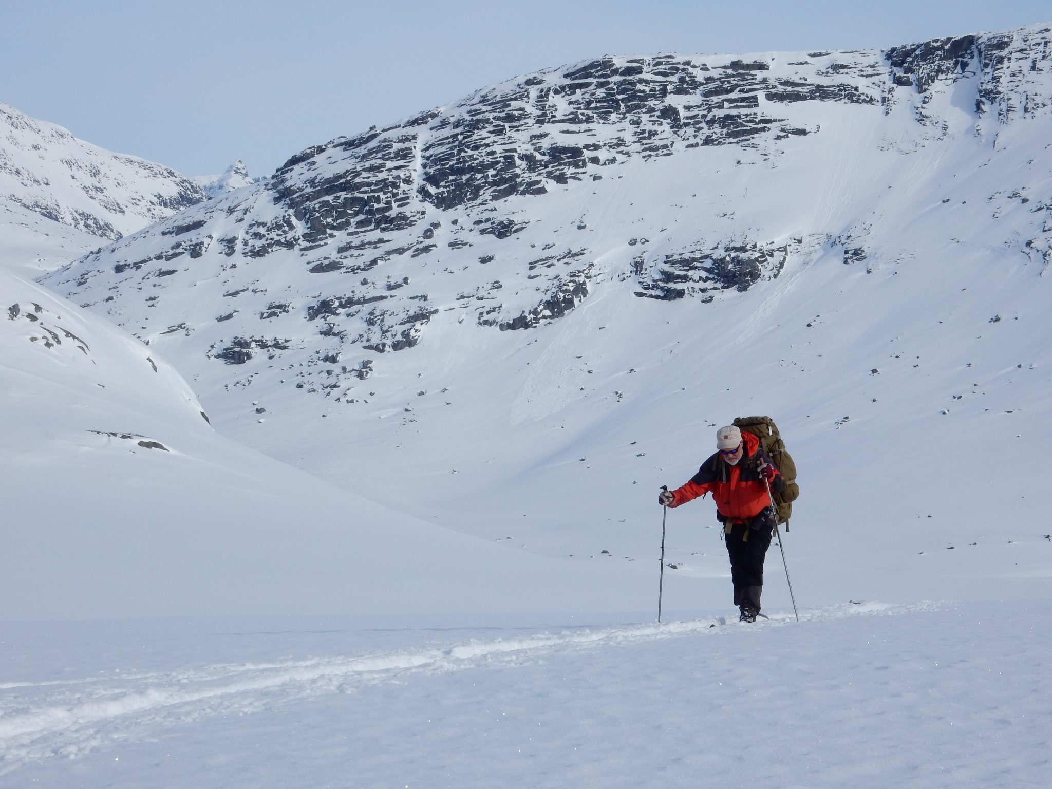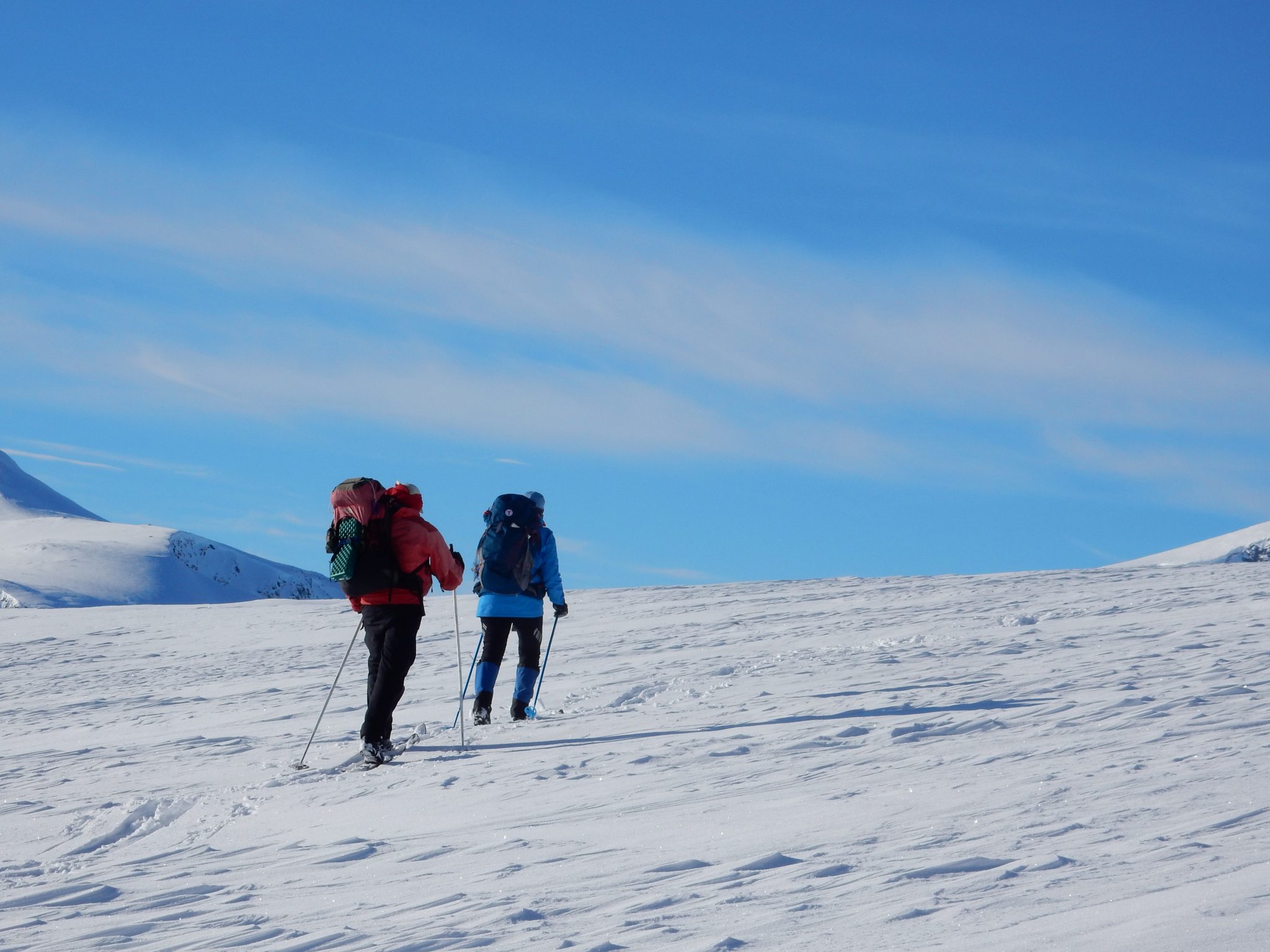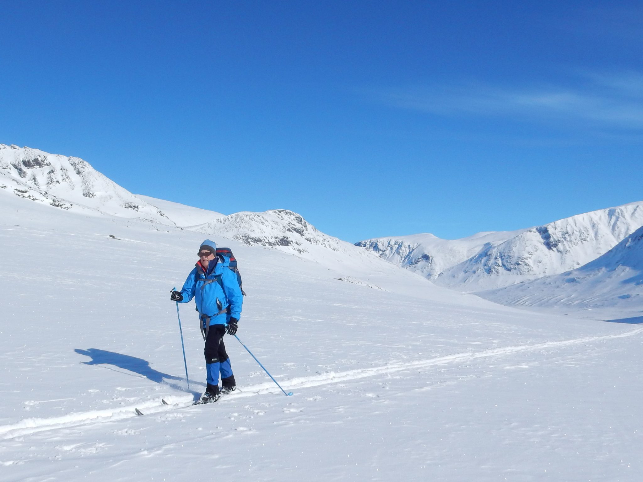 This was the third year that my husband, Chris, and I had joined a Norwegian Trekking Association group to travel on Nordic skis across mountain regions of Norway. We’re not normally joiners and we guard our independence on extended bike tours, but for our first Norwegian ski venture in 2014 we’d joined Den Norske Turistforening to learn the workings of their extensive hut system. This set us on a positive learning curve for choosing equipment, understanding potential safety issues, and getting to know Norwegian mountain weather. We so enjoyed that first tour in 2014, that in 2015 we signed up for two separate week-long tours, allowing rest for our aging bodies between outings.