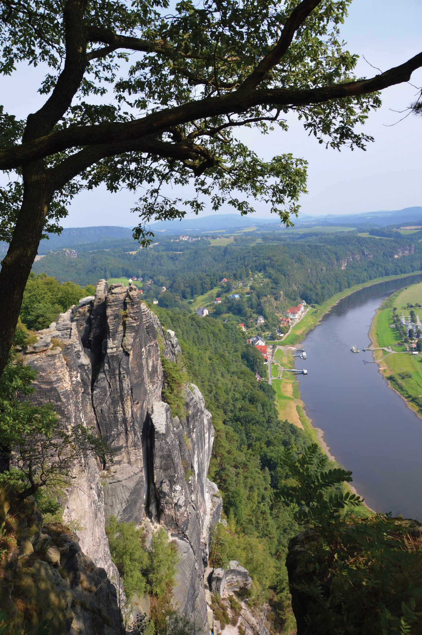 - Saxon Switzerland terrace view of the Elbe River, villages and sandstone spires.