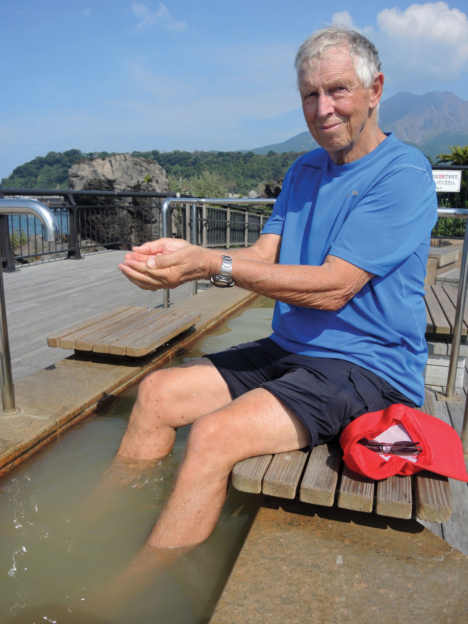 - The author washes his feet in hot spring water at Sakurajima, an active composite volcano and former island in Kagoshima, Japan.