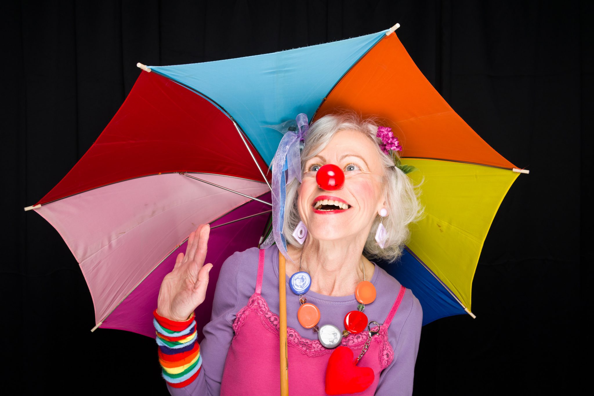 Scott adds, “To further reduce the possibility of confusion when visiting older people, many of whom have compromised experiences of reality, we wear very little, if any, face make-up. We want them to see clearly the human being who is visiting with them. We rely on our red noses and outlandish garb to send the message that ‘we’re not from around here.’ And we are careful to adjust our energy level to meet theirs. We are not there to overwhelm or even entertain them, but rather invite them to play and be with us in the magical place of ‘Now.’”