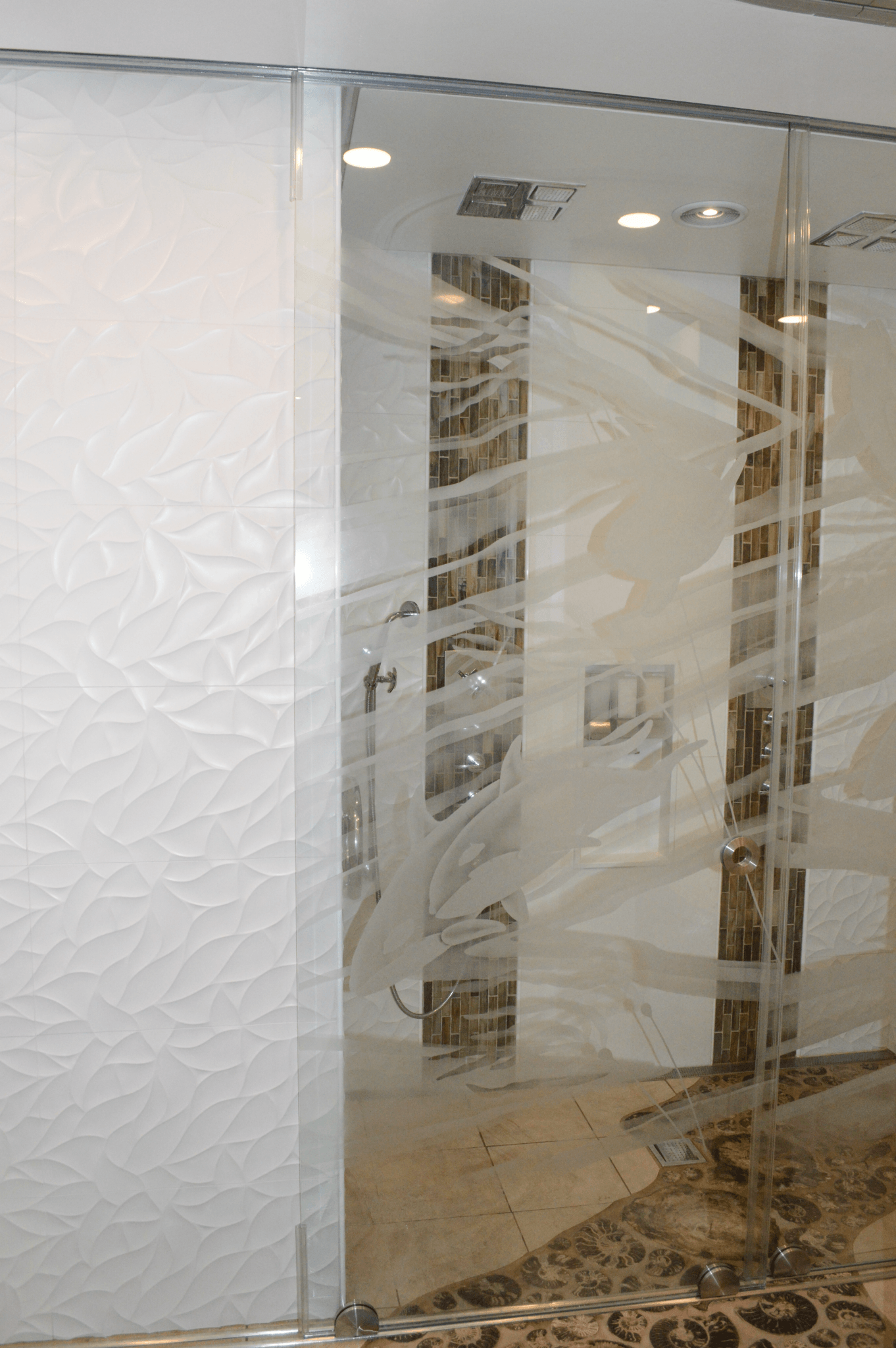 - An orca adorns the glass doors of the accessible shower. Photo by Bailey Martens.