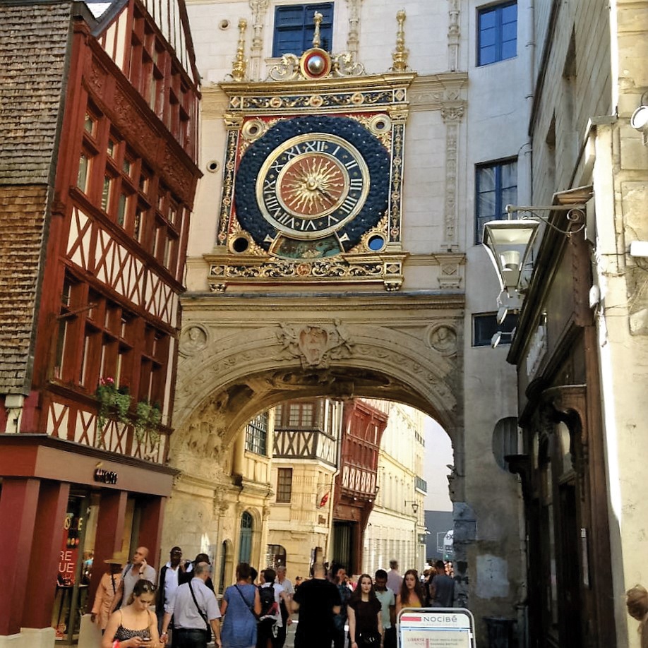 Weaving onward through narrow streets, we pass former stone-built palaces and more of Rouen’s 700 half-timbered houses. A 16th century astronomical clock decorates an archway, its gilded face featuring one single hand. We guess that knowing the hour was enough for early folk. In Market Square, a plaque identifies where Joan of Arc was burned at the stake for alleged heresy. At her nearby memorial church, a white marble statue evokes her saintly grace.