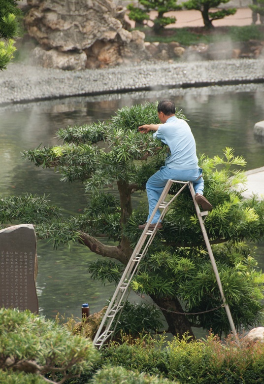 As birds exchange morning messages, their songs mingle with the gurgle and roar of falling water to overwhelm the nearby traffic noise. We inhale the rosemary-like scent of pine and sweet aroma of the banyan groves. A refreshing mist follows us on the one-way route past fountains and waterfalls, reflecting ponds of pink and vanilla lotus blossoms and the central water feature ablaze with milky white and tangerine giant koi. Broad straw hats protect the bowed heads of countless workers tending to the myriad green-shaded grasses of the meticulously manicured gardens.