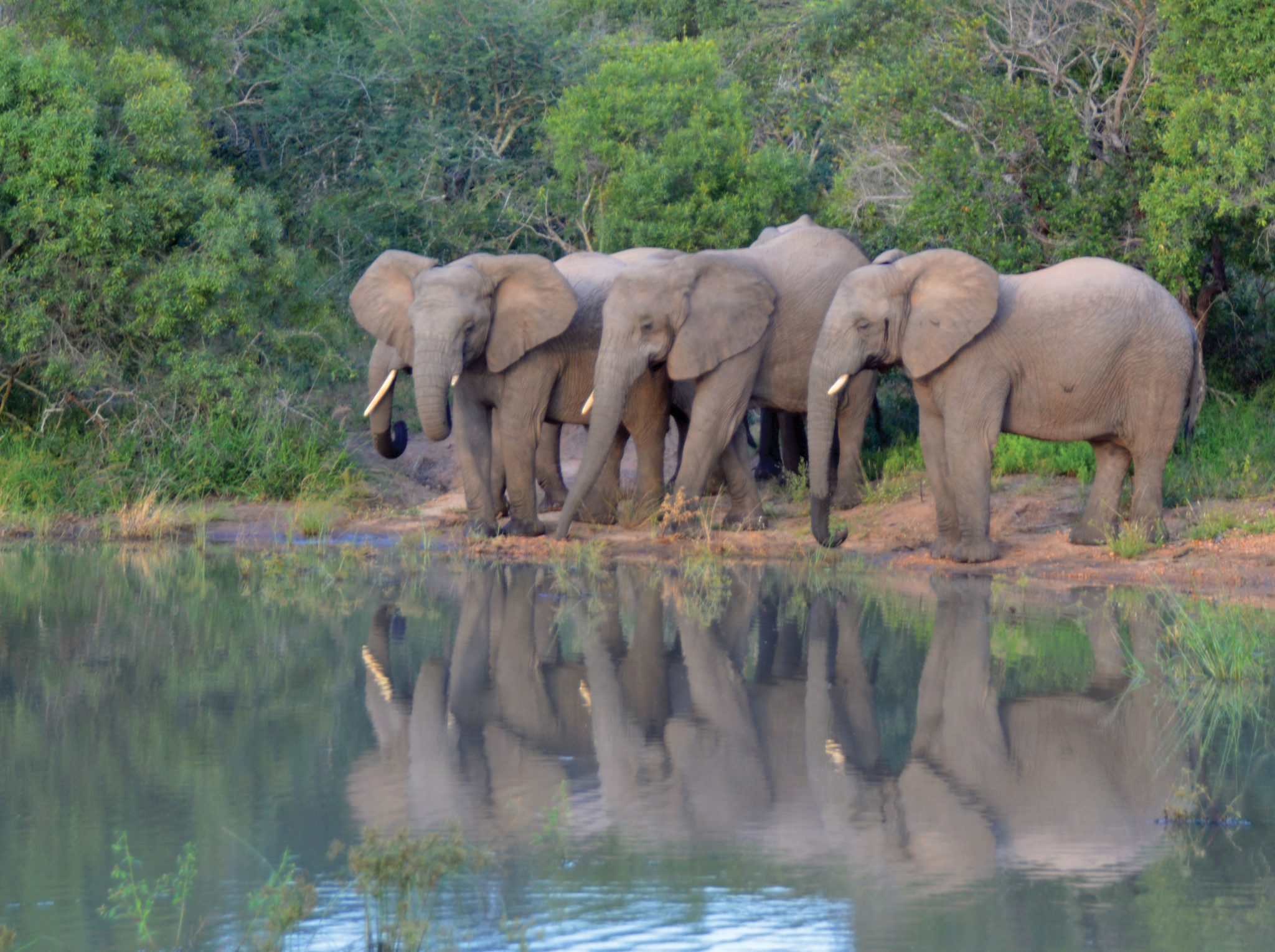 Noelle drives slowly off-road through thickets and brush until we come to a pond where a dozen elephants are drinking water. We sit in the truck along the water’s edge watching and photographing the amazing scene. One elephant comes quite close to me and looks me in the eyes before moving on. Others begin to eat from trees lining the pond.