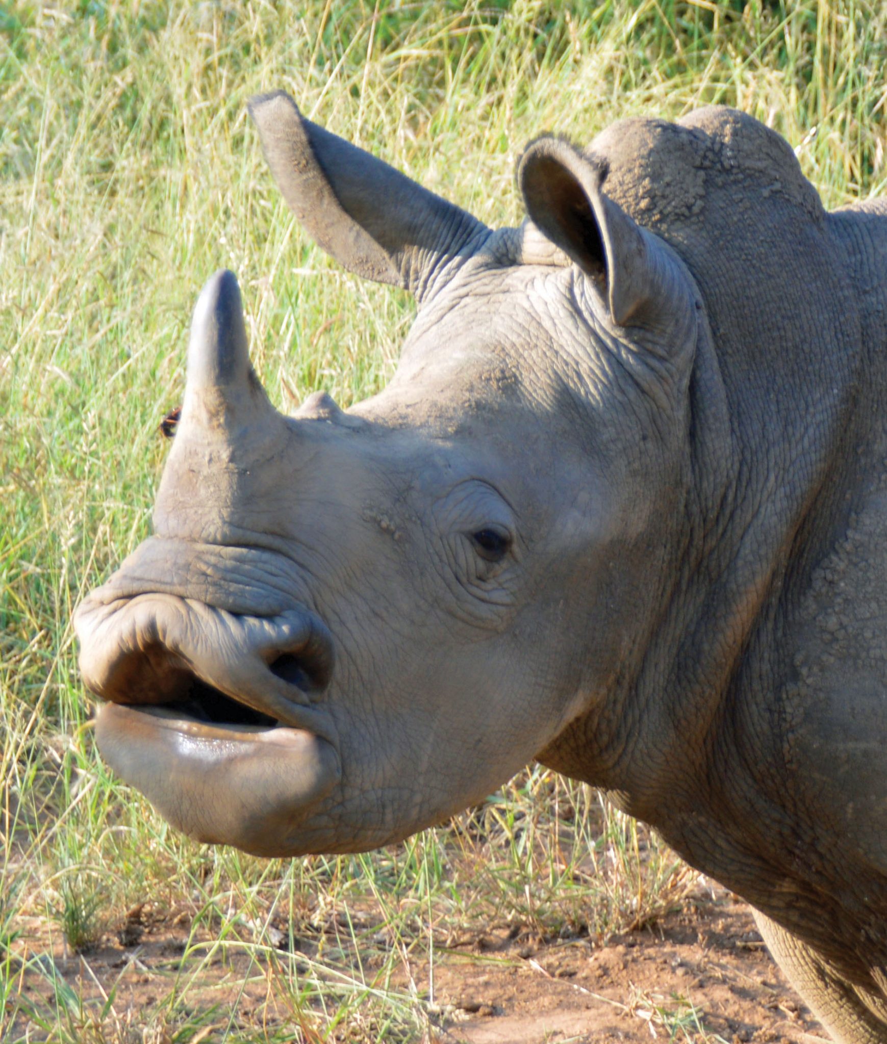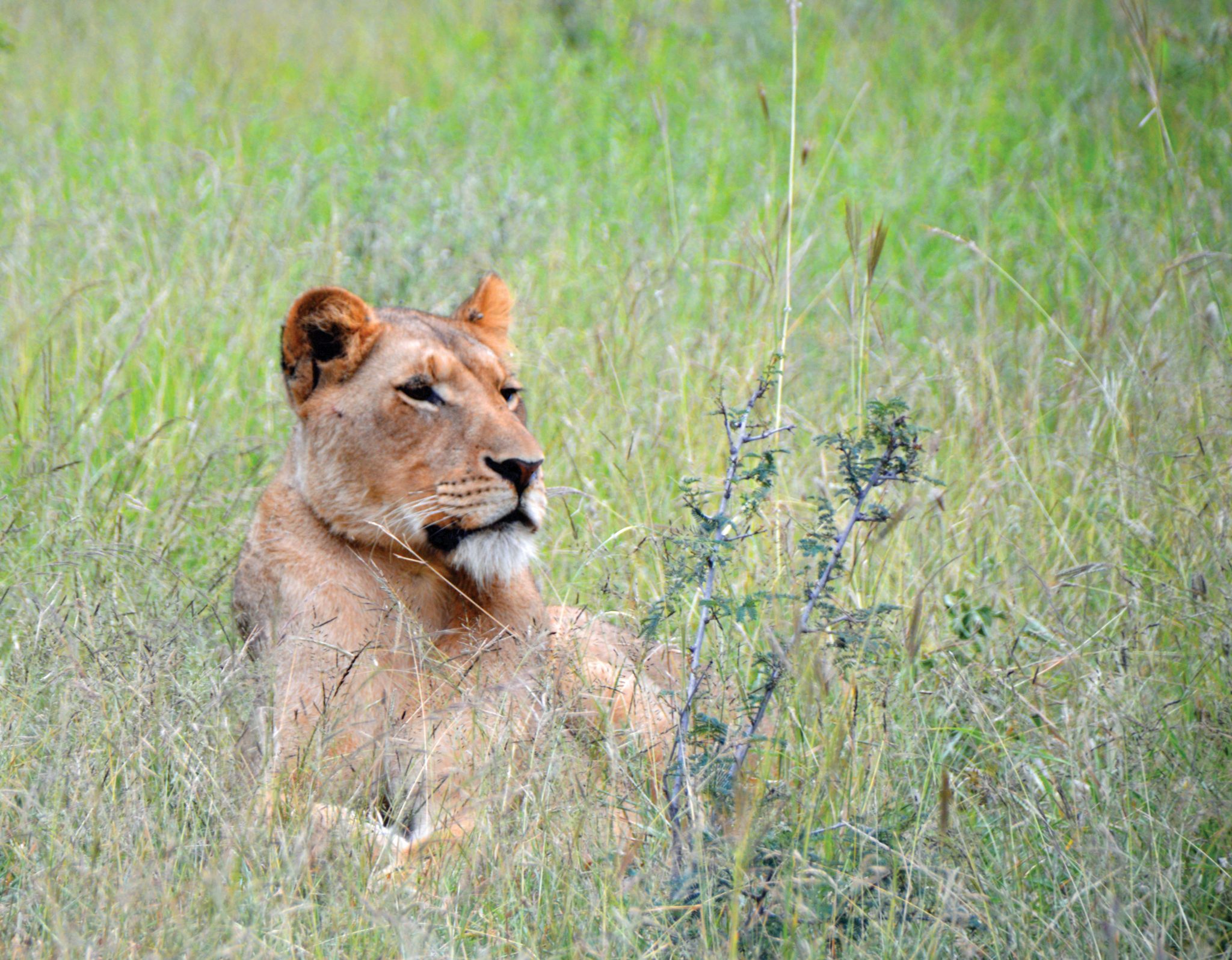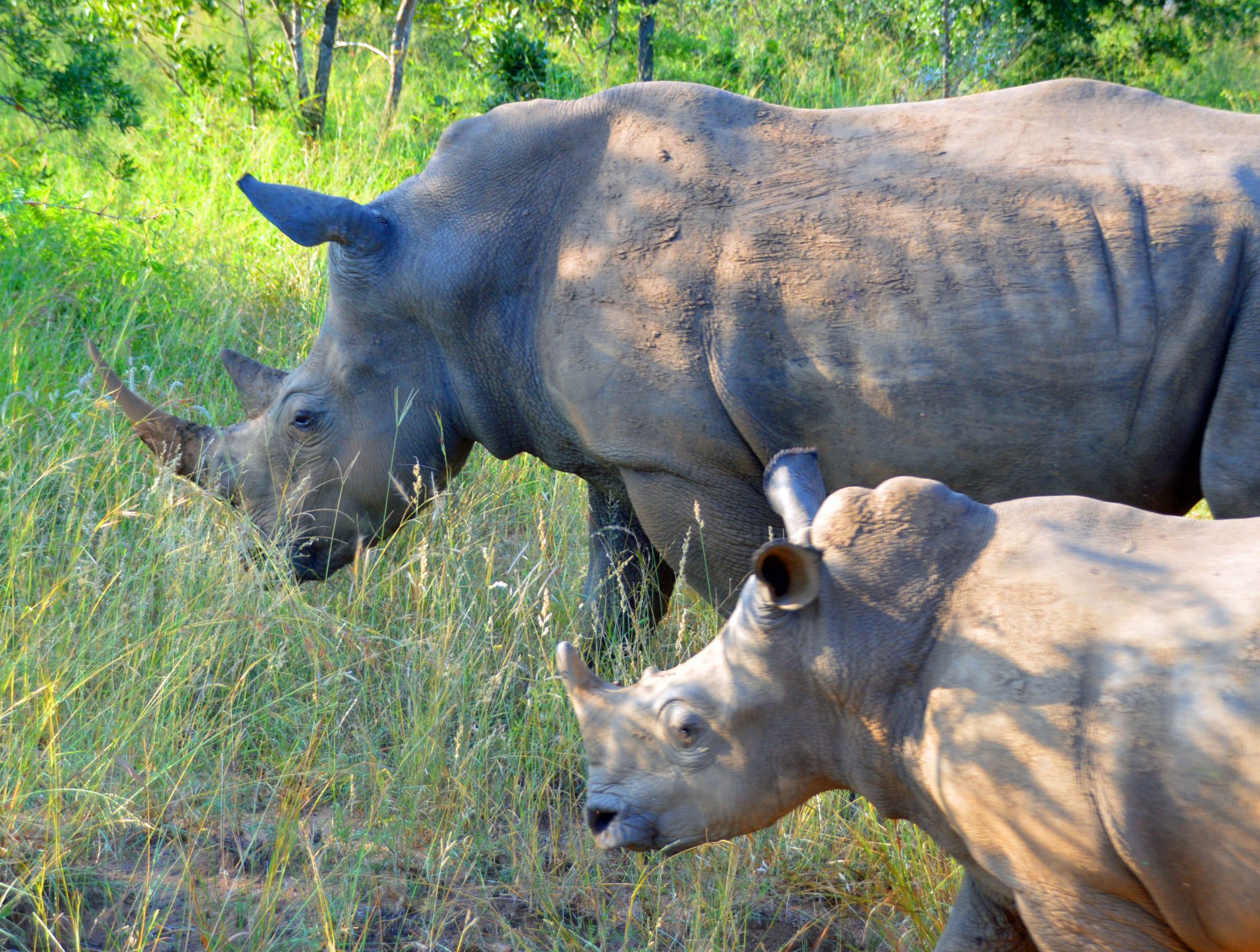 Lawrence often spots lion tracks and can recognize when they were made. We see several lions on our game drives. One day, we come across a mother rhino and her baby resting in the road. We wait until they move off, photographing the youngster yawning before following his mother into the underbrush. We come upon zebras and giraffes; gazelles and nyala antelope; baboons, Cape buffalo, monkeys and wart hogs.