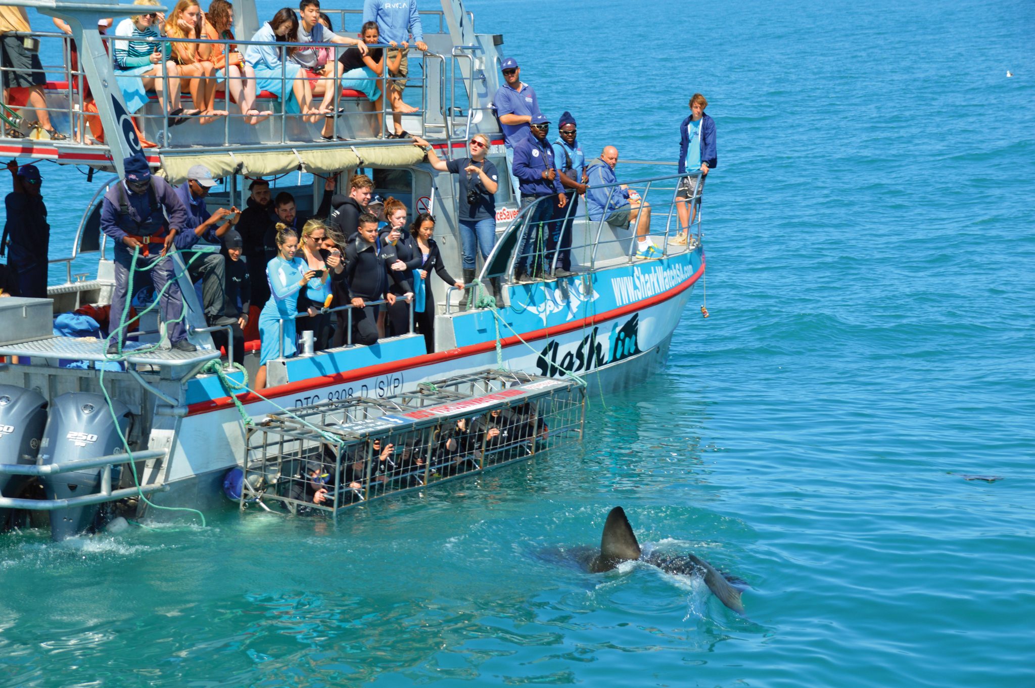 On the way back, we see a shark cage ship, where passengers put on wetsuits and get into the cage suspended on the side of the boat. We watch as the sharks circle the cage. The area is known as shark alley and great whites are often seen here.