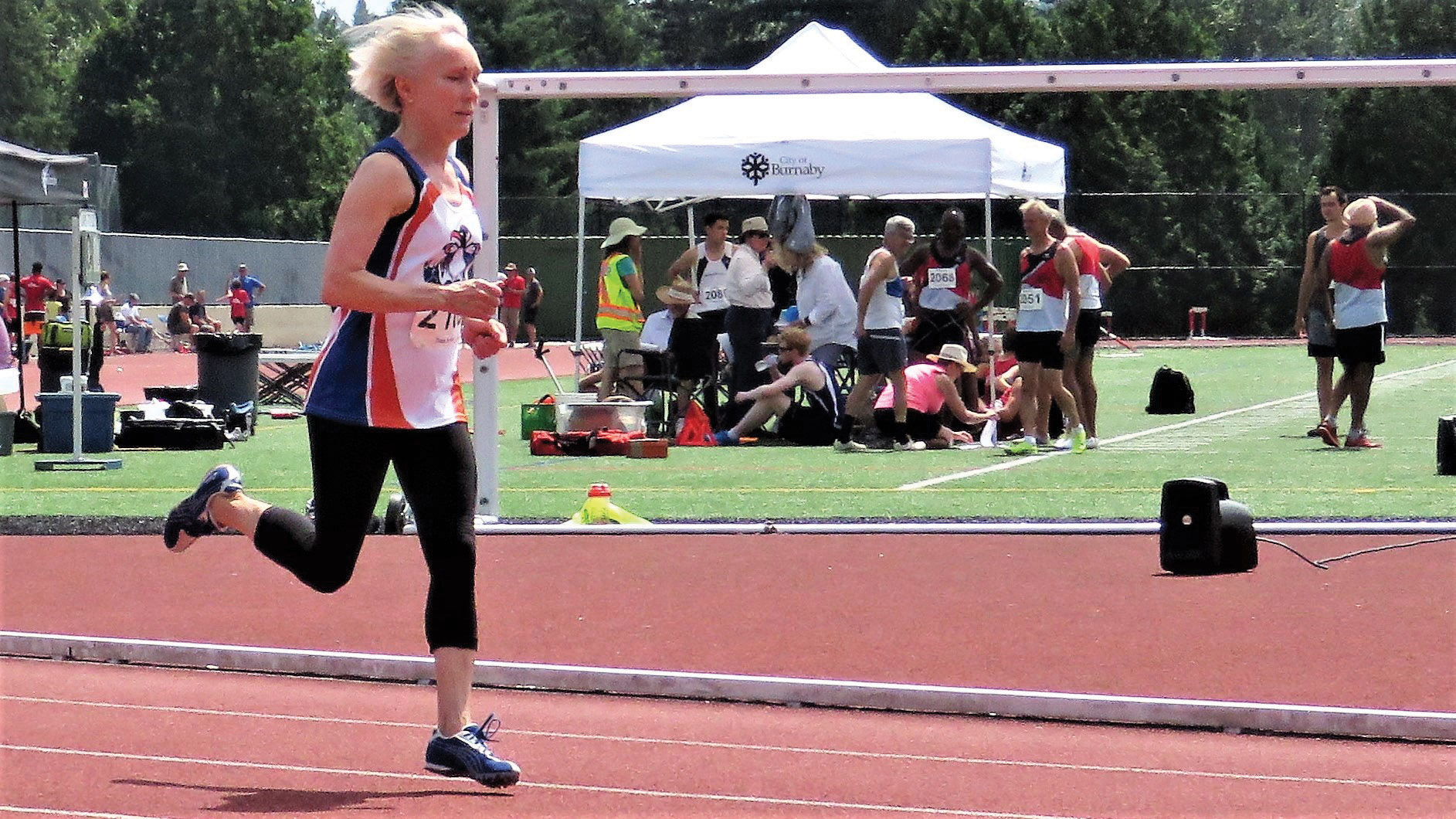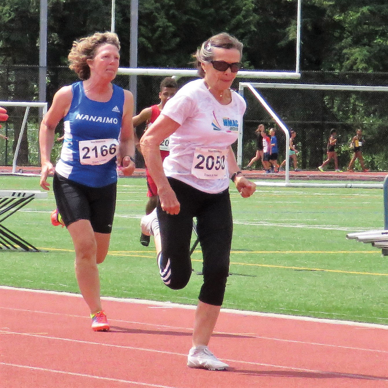 - Christa Bortignon (in white tee) sprinting to a 100-meter finish.