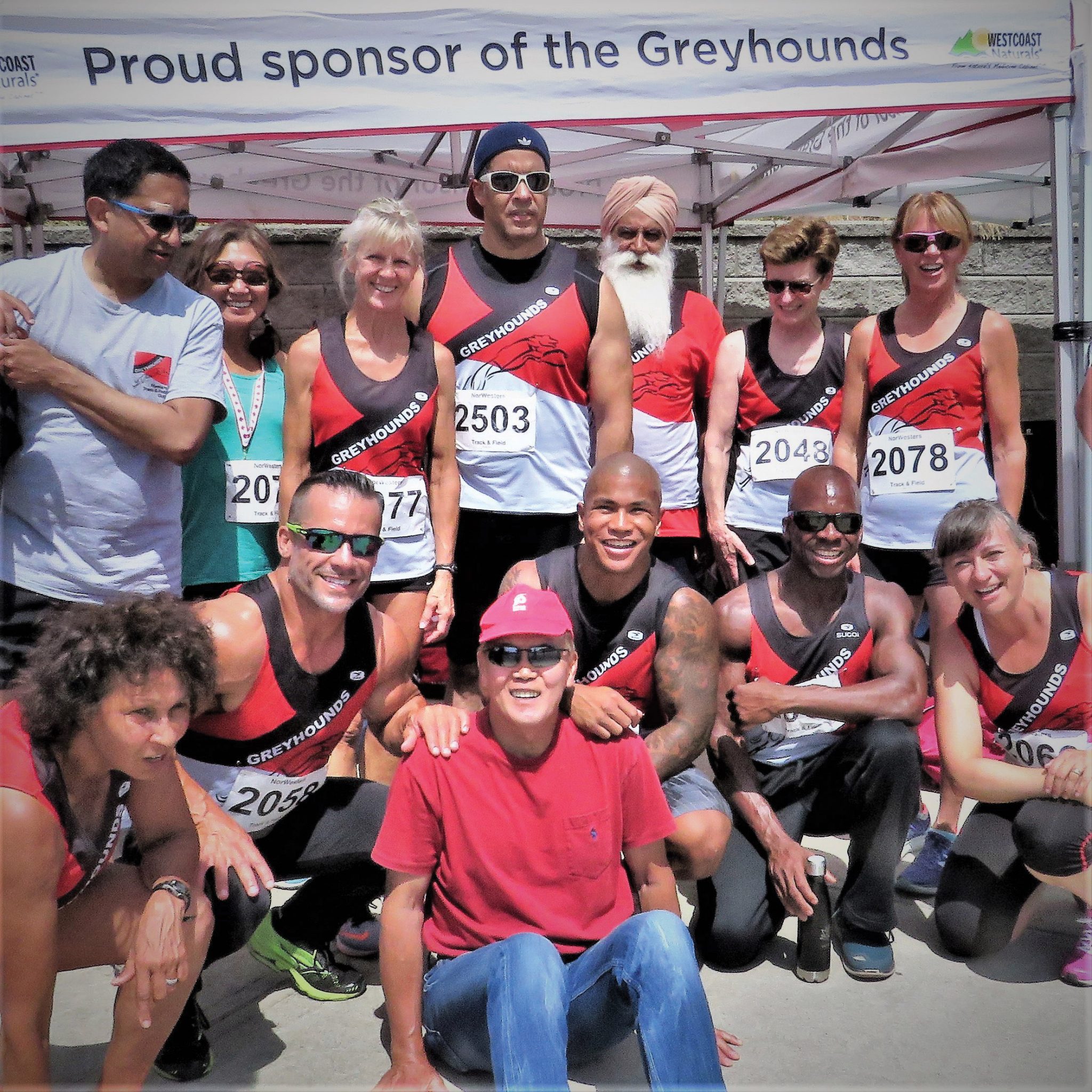 - Harold Morioka, Head Coach of The Greyhounds Track & Field Club (in red tee and visor) surrounded by enthusiastic members